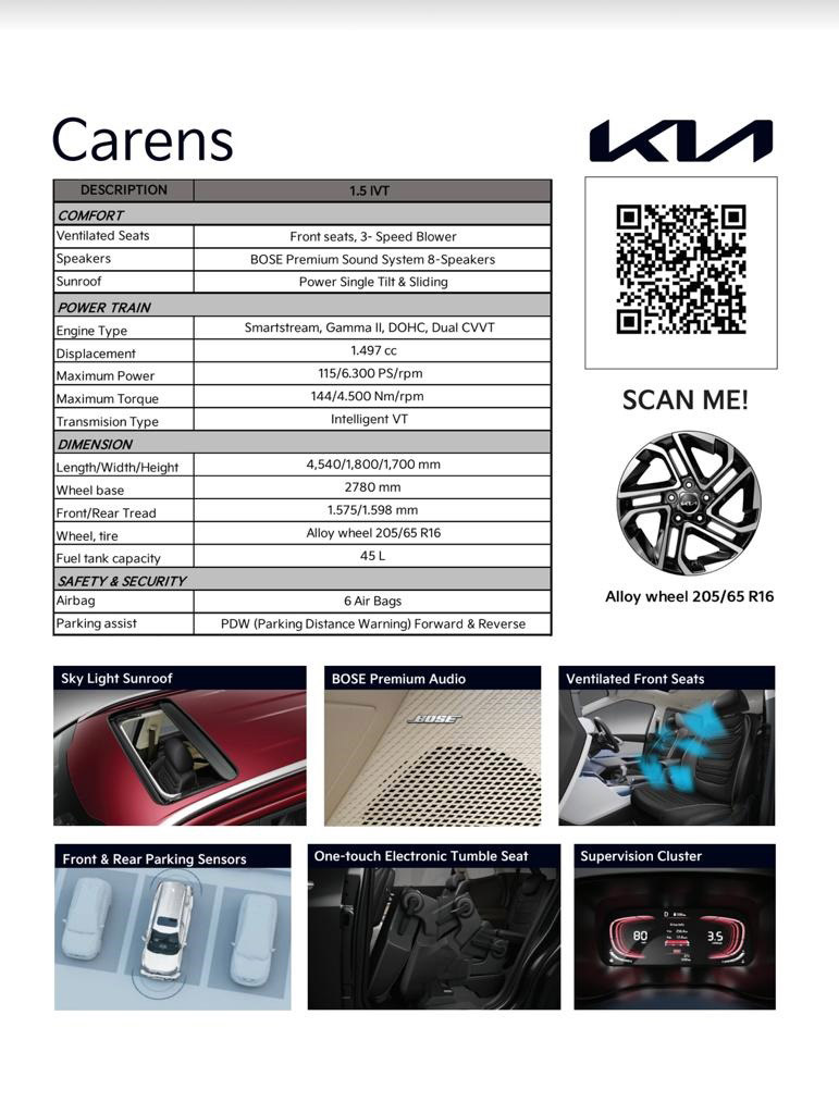Tampilan Carens yang sporty, ruang kabin yang lapang serta berbagai fitur berteknologi tinggi menjadi keunggulan yang ditawarkan dan menyuguhkan perbedaan di kelas MPV keluarga.